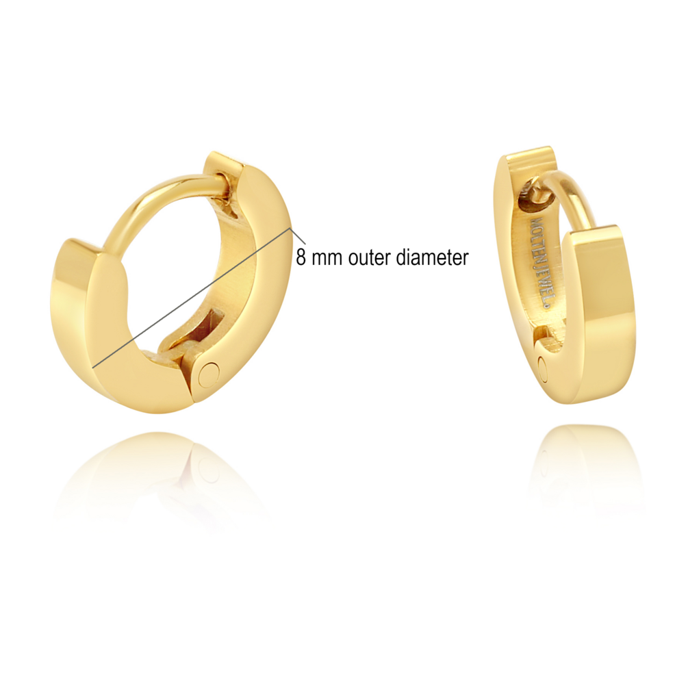 Whether worn alone or as part of your curated ear, you'll love the modern and classic Maddie Huggie Earrings in 14k Yellow Gold Plated Titanium Steel, with a minimalist geometric pattern that adds just a little extra something.